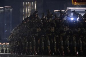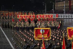 Son columnas del Ejército Popular de Corea que pasan por la plaza de la parada militar por el aniversario 80 de la fundación del Partido del Trabajo de Corea bajo la inspección del Presidente de Asuntos Estatales Kim Jong Un.