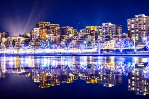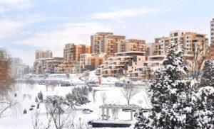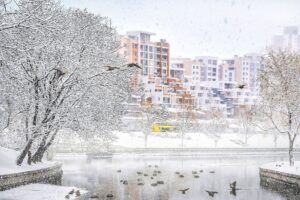 Son imágenes tan pintorescas del paisaje invernal en la zona residencial con terrazas a orillas del rio Pothong de la capital Pyongyang de la RPDC, cuyo nombre es el barrio Kyongryu (desván de perlas).